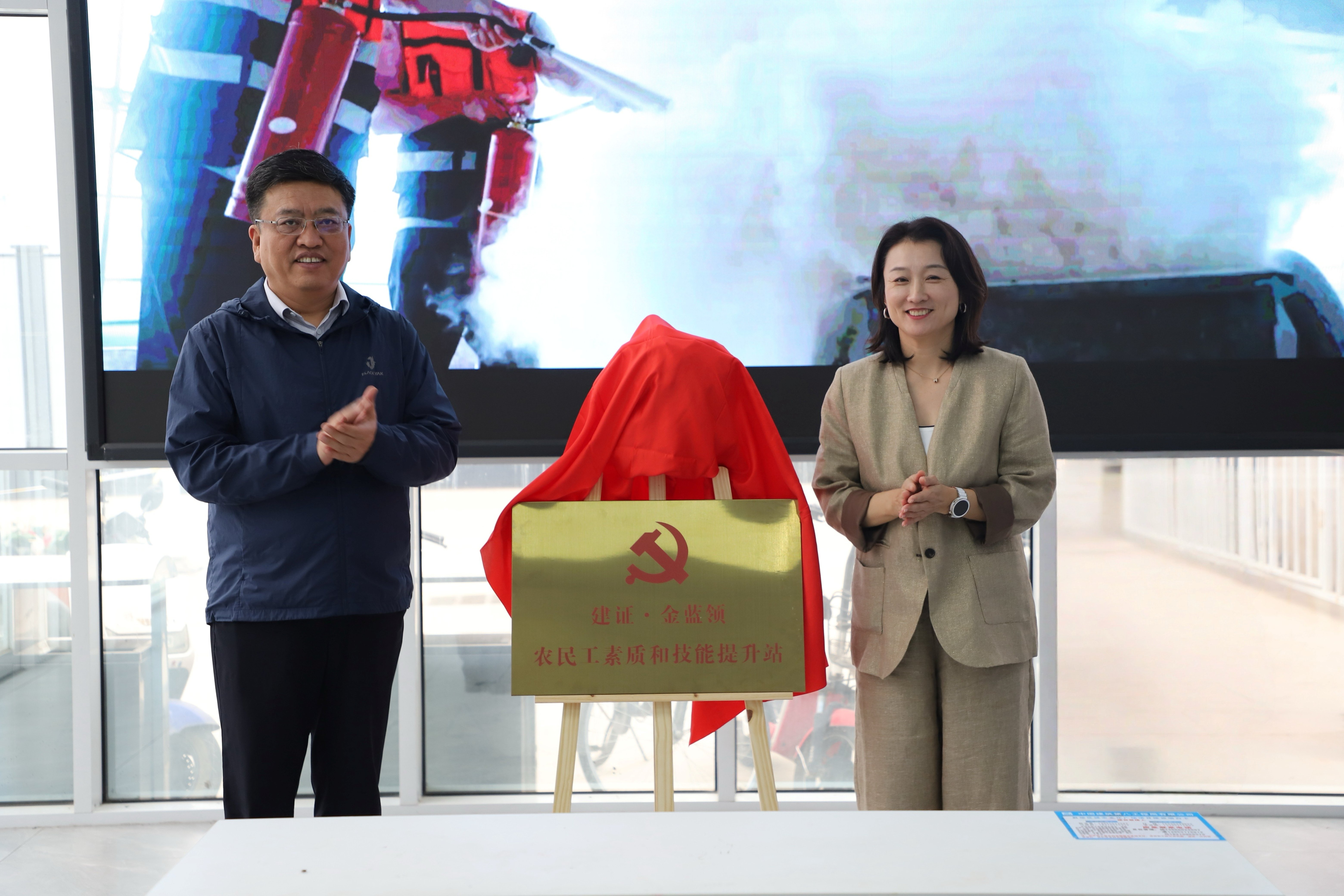 期間,譚博一行參觀了項(xiàng)目綜合展廳、工友綜合服務(wù)中心與工友生活區(qū),詳細(xì)了解項(xiàng)目建設(shè)進(jìn)展與生活工作條件,對(duì)項(xiàng)目工會(huì)工作開(kāi)展情況給予肯定。譚博、聶麗共同為項(xiàng)目“建證·金藍(lán)領(lǐng)”農(nóng)民工素質(zhì)和技能提升站揭牌。