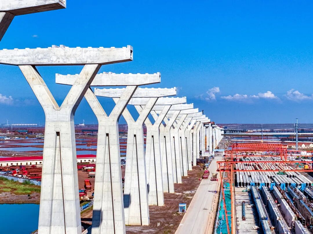 大橋南側沿線道路全長8.868公里,是唯一穿越濱州北部海岸灘涂,實現套爾河兩岸完全連通的關鍵道路。面對海風、高鹽、凍融等自然環境挑戰,跨越多個最大面積達5萬畝,水深超7米的鹽田、蝦池,如同在海水里修通一條道路。