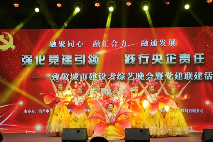 2020-08-30 濱州市政項目舉辦致敬城市建設者綜藝晚會暨黨建聯建活動啟動儀式 8月28日是山東濱州市撤地設市二十周年,中建八局聯合濱州市住房和城鄉建設局、濱州財金集團、濱州傳媒集團,在公司承建的濱州市政項目共同舉辦“融聚同心、融匯合力、融通發展----致敬城市建設者綜藝晚會暨黨建聯建活動啟動儀式”。